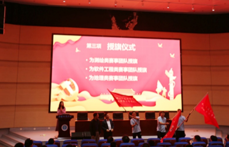 刘修国为测绘类赛事团队、软件工程类赛事团队、地理类赛事团队代表授旗。