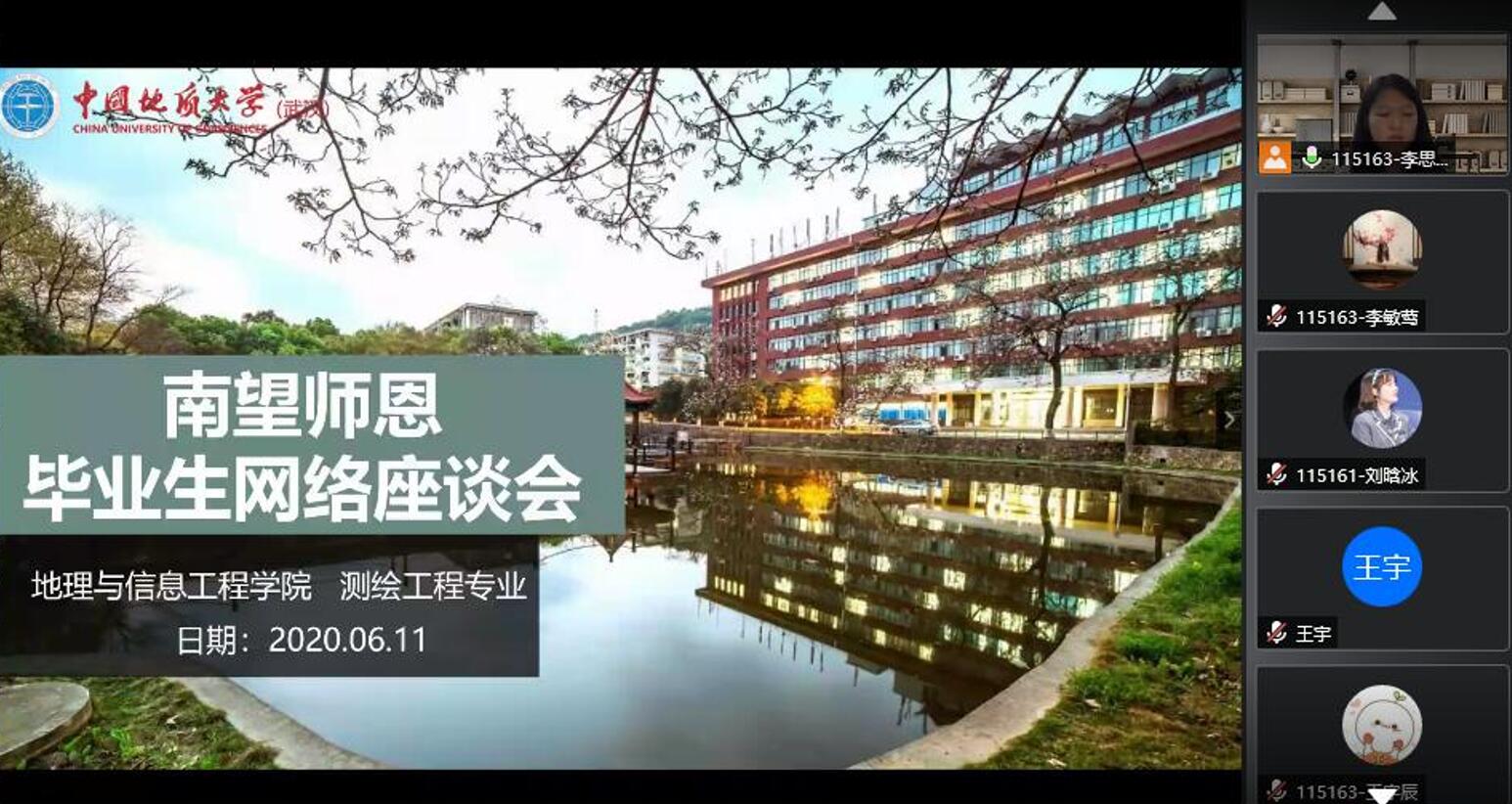 (通讯员:李思琪)今朝相聚,已是毕业时。由于疫情原因,测绘工程专业2020届毕业生于6月11日晚上19:30隔空举办了这场特别的“南望师恩毕业生网络座谈会”。会议邀请到测绘科学与技术系党支部书记及系副主任徐景田老师、系副主任及班主任丁开华老师,班主任赖祖龙老师、岳迎春老师,以及项目经验非常丰富的明祖涛老师前来参会。