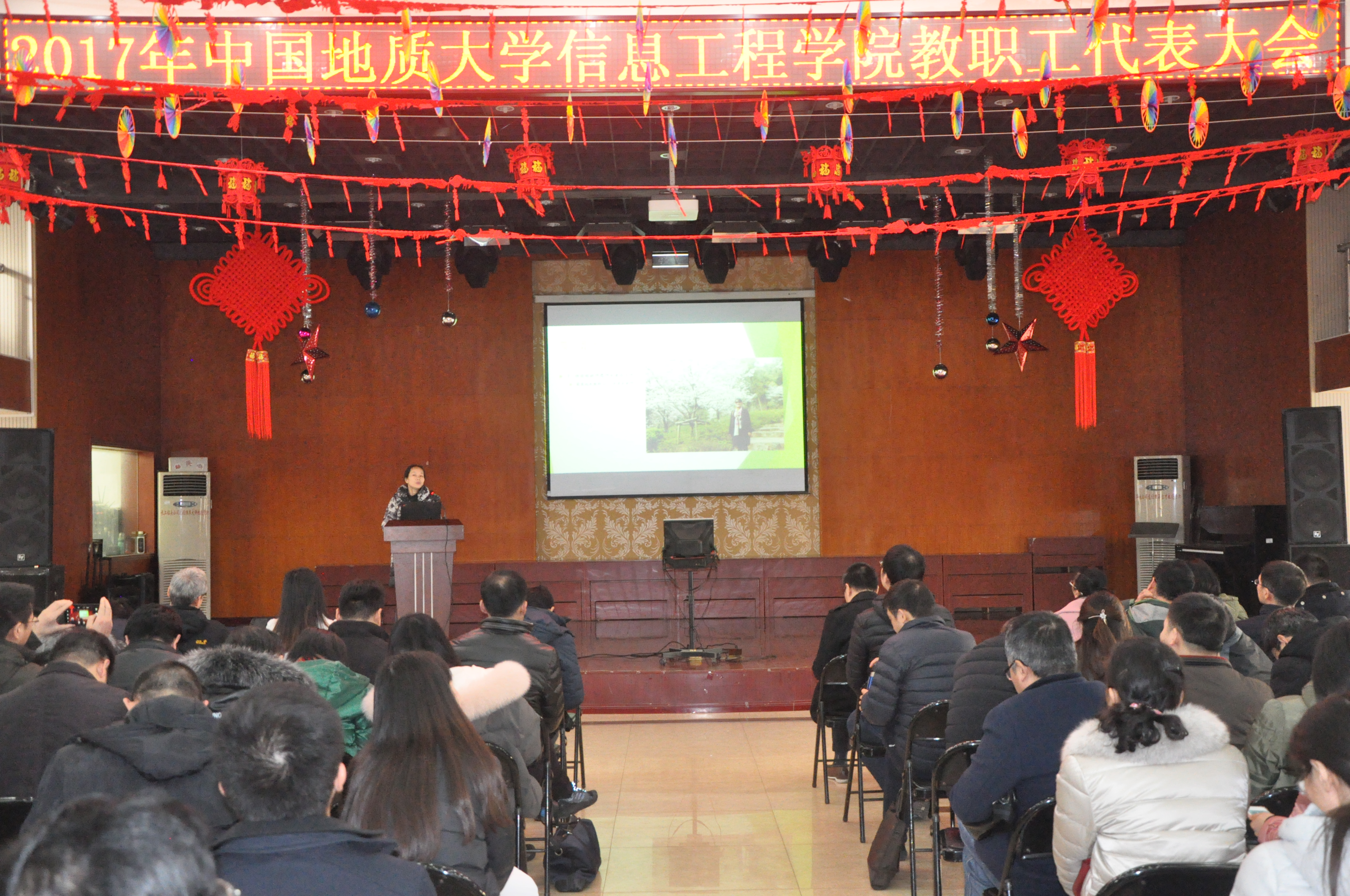 2018年1月23日下午14时,信息工程学院在校工会一楼教工活动中心召开2017年教职工大会。全院教职工参会,由副书记许德华主持,大会的主要任务是审议院长工作报告、学院财经工作报告和工会年度工作报告。