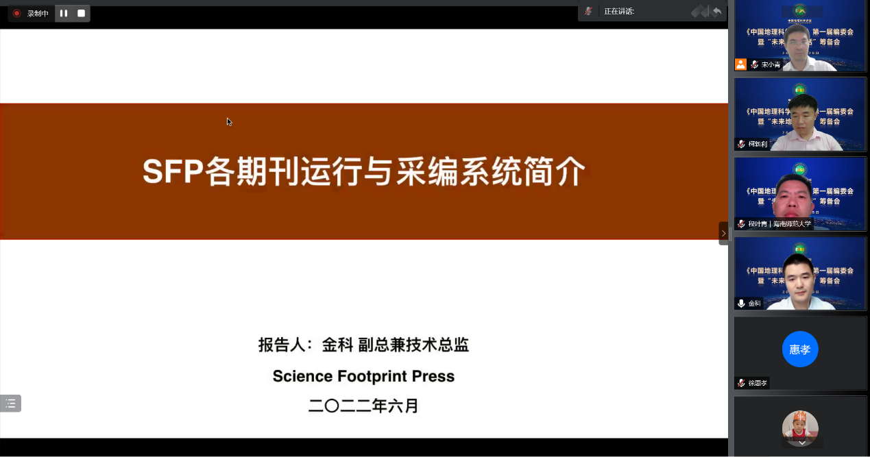 SFP副总裁兼技术总监金科详细介绍了SFP各期刊运行情况和SFP采编系统,提出了支持《中国地理科学评论》发展的配套措施,承若全力配合期刊编委会的相关工作,与编委会一起打造中国地理学界的高质量学术期刊。