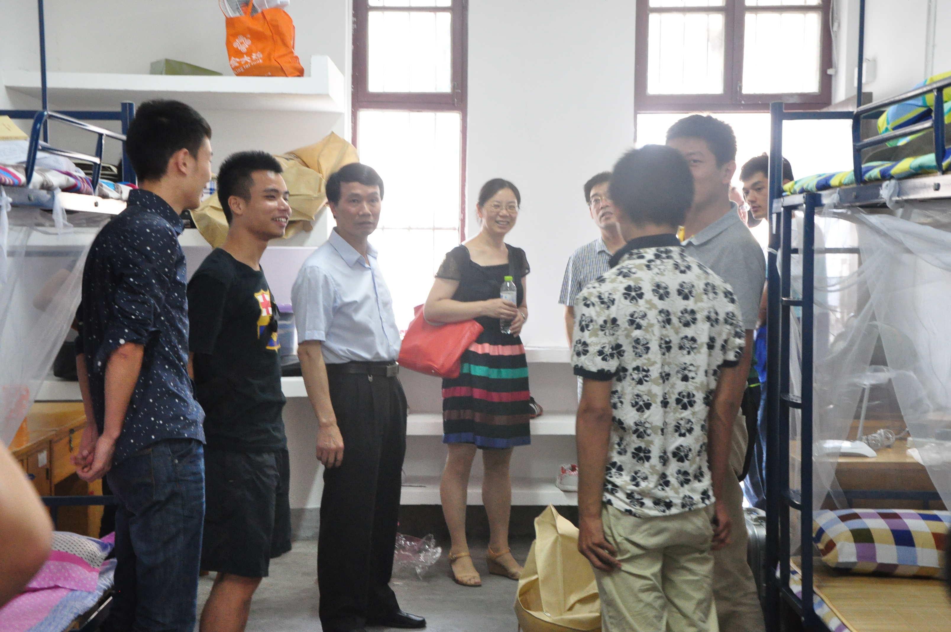 院领导和各班主任老师先从男生宿舍出发,依次走访了52栋、53栋男生宿舍以及女生全体宿舍。走访男生宿舍时,院领导对宿舍的热水供应、东西摆放、采光等一系列问题进行了详细的询问,并与许多在寝室的新生家长就一些生活适应问题进行了交流。女生宿舍相对宽敞,在对女生宿舍进行走访时,院领导详细询问的是宿舍成员情况,并嘱咐寝室成员之间要多交流,快速适应大学生活等。