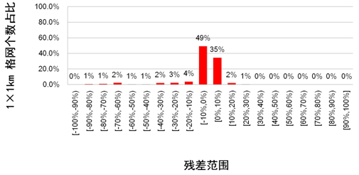 (2) 约70-80%的残差绝对值小于10%;约80%-90%的残差绝对值小于20%,说明OSM建筑数据完整性的估计值与实际值相似(图2和图3);