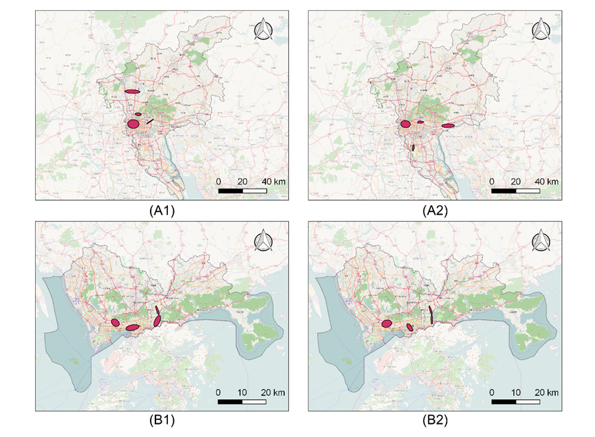 6 小区开放交通拥堵主要区域的变化:(A1)广州实施前,(A2)广州实施后,(B1)深圳实施前,(B2)深圳实施后