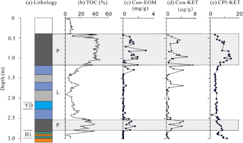 主要发现湖沼沉积序列中的脂肪酮以长链的C29为主,通过对比脂肪酮和正构烷烃、脂肪酸的分布模式和在沉积序列中较为相似的变化趋势,确定了脂肪酮来源于正构烷烃和脂肪酸的微生物氧化。在沉积序列中,脂肪酮的平均碳链长度ACL、中链与长链比值(C23+C25)/(C27+C29)与木本、草本和蕨类植物的相对丰度呈现一致的变化趋势,表明脂肪酮具有追踪古植被和古气候变化的潜力。脂肪酮的碳优势指数CPI随岩性而变化,在泥炭沉积中CPI值较高,在湖泊沉积中CPI值较低,而古水文条件的变化对于泥炭和湖泊的交替演化具有重要影响,这表明脂肪酮CPI指数具有反映古水文条件的潜力。
