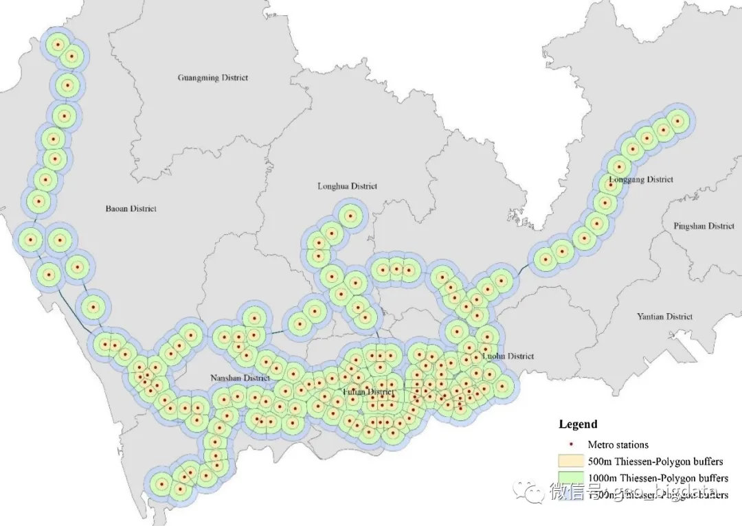 本研究以浮动自行车数据和街景图像数据为基础,旨在探讨在深圳地铁站周围视域范围内的植被覆盖程度(绿化水平)与骑行行为之间的关系。结果表明,在地铁车站周边500米、1000米、1500米3个缓冲区范围内,视域范围内的绿化(eye-level greenness)与骑行频率呈正相关。