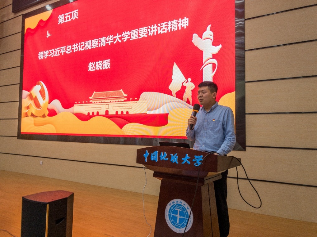 学院团委副书记赵晓振带领与会师生一起学习习近平总书记视察清华大学发表的重要讲话精神。他鼓励本科生要以学业为重,用知识武装自己;鼓励研究生做好科研任务,为以后的学术科研之路打下坚实的基础。